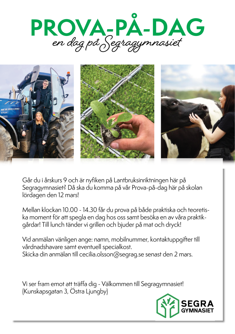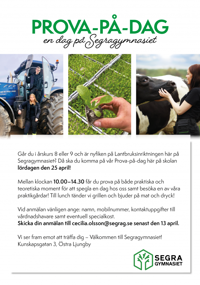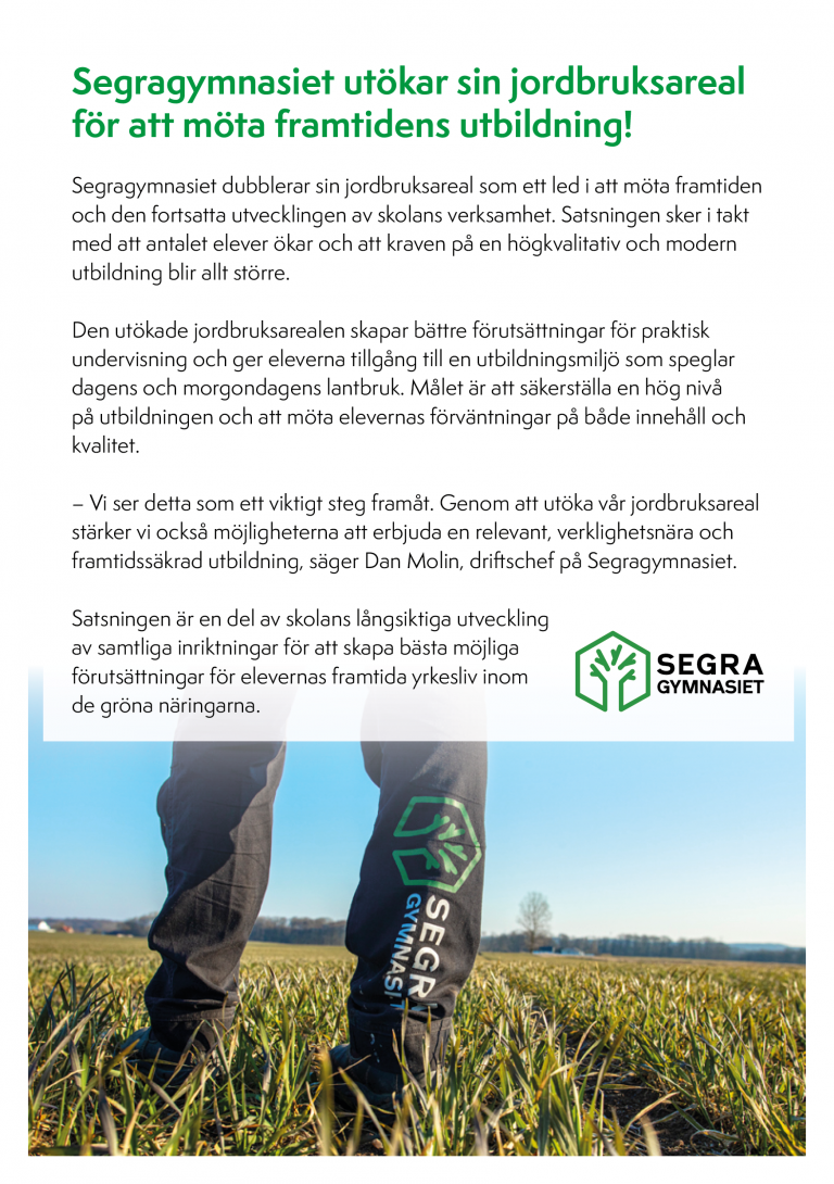 Segragymnasiet skall vara det självklara valet för ungdomar som vill utbilda sig inom Lantbruk, Hästhållning och Djurvård.